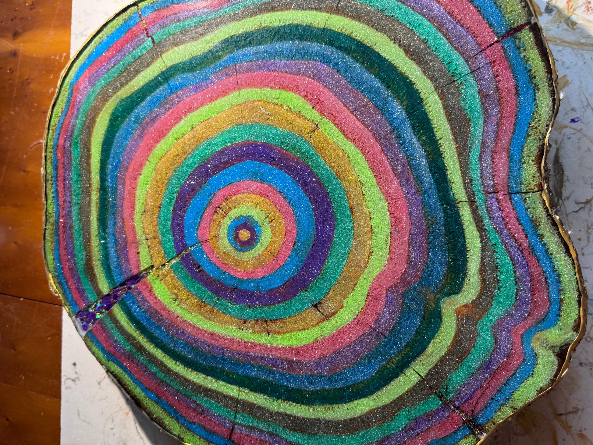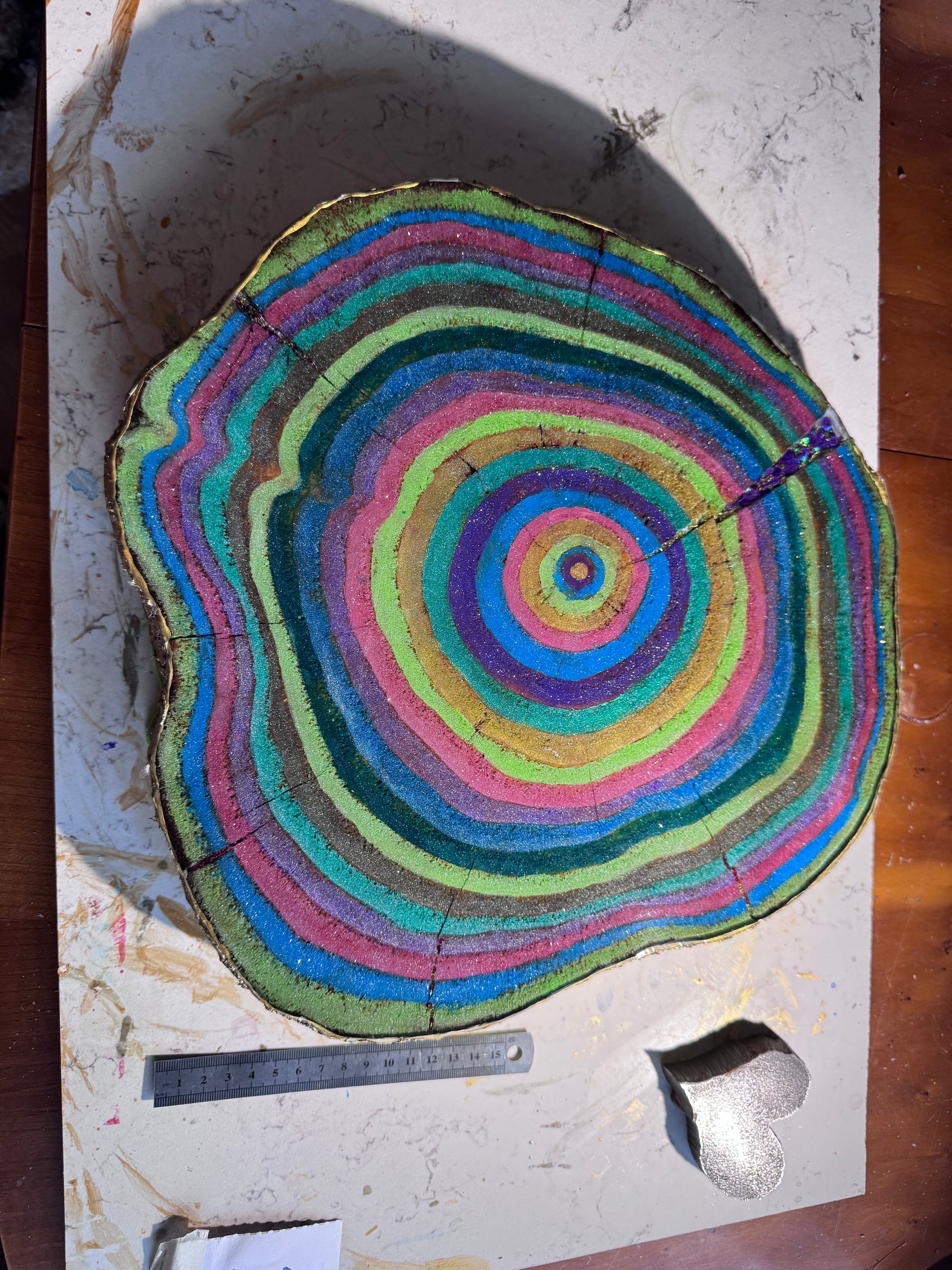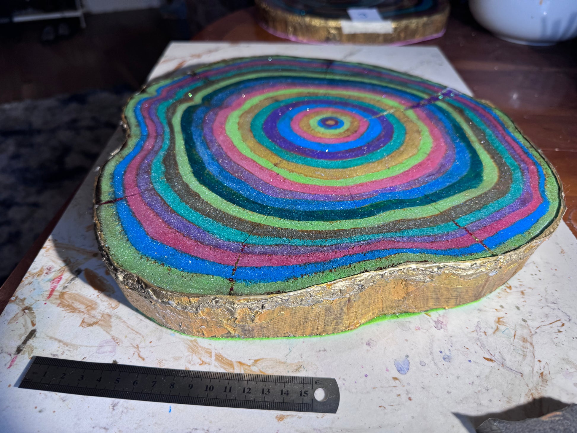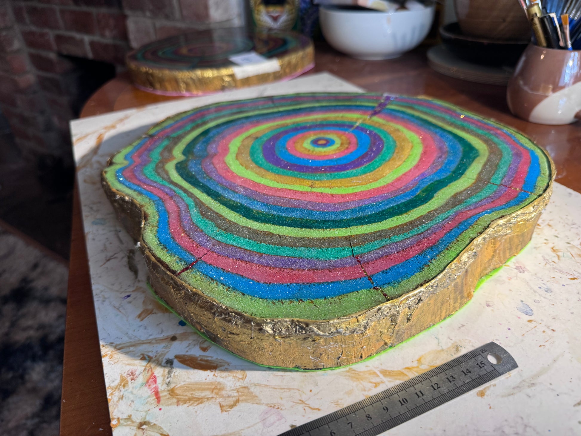 A large 35cm diameter tree slice, painted, epoxied and felt backed. The epoxy is none toxic/eco friendly. The majority of the proceeds from the sale of this plinth will go to displaced Palestinian families.