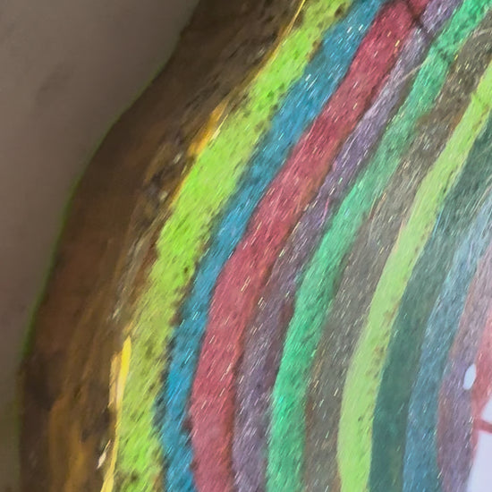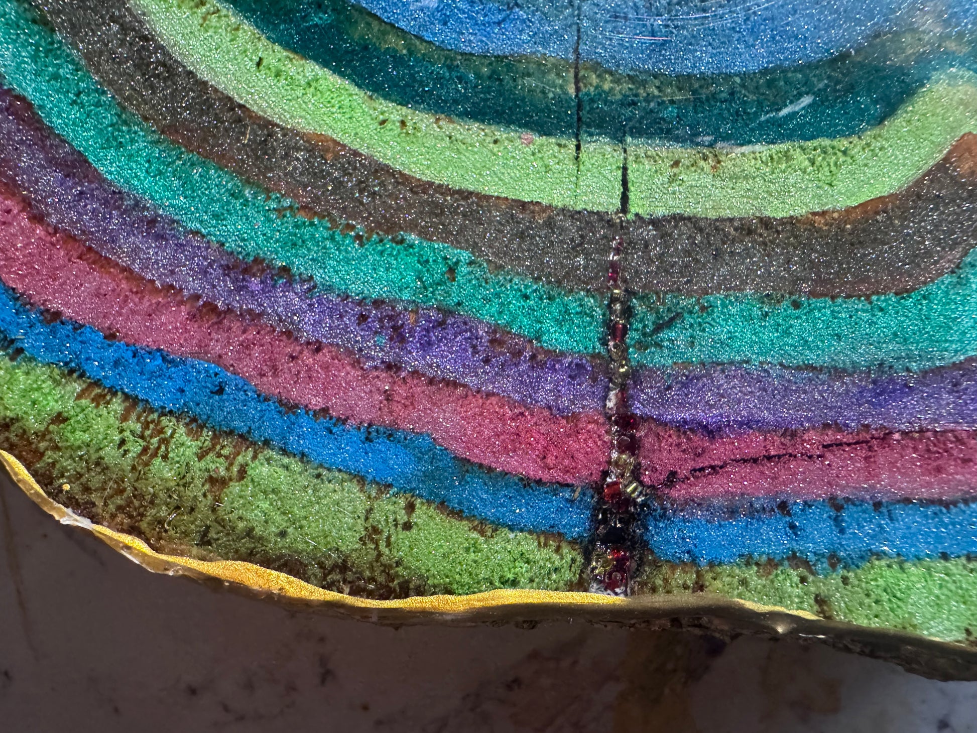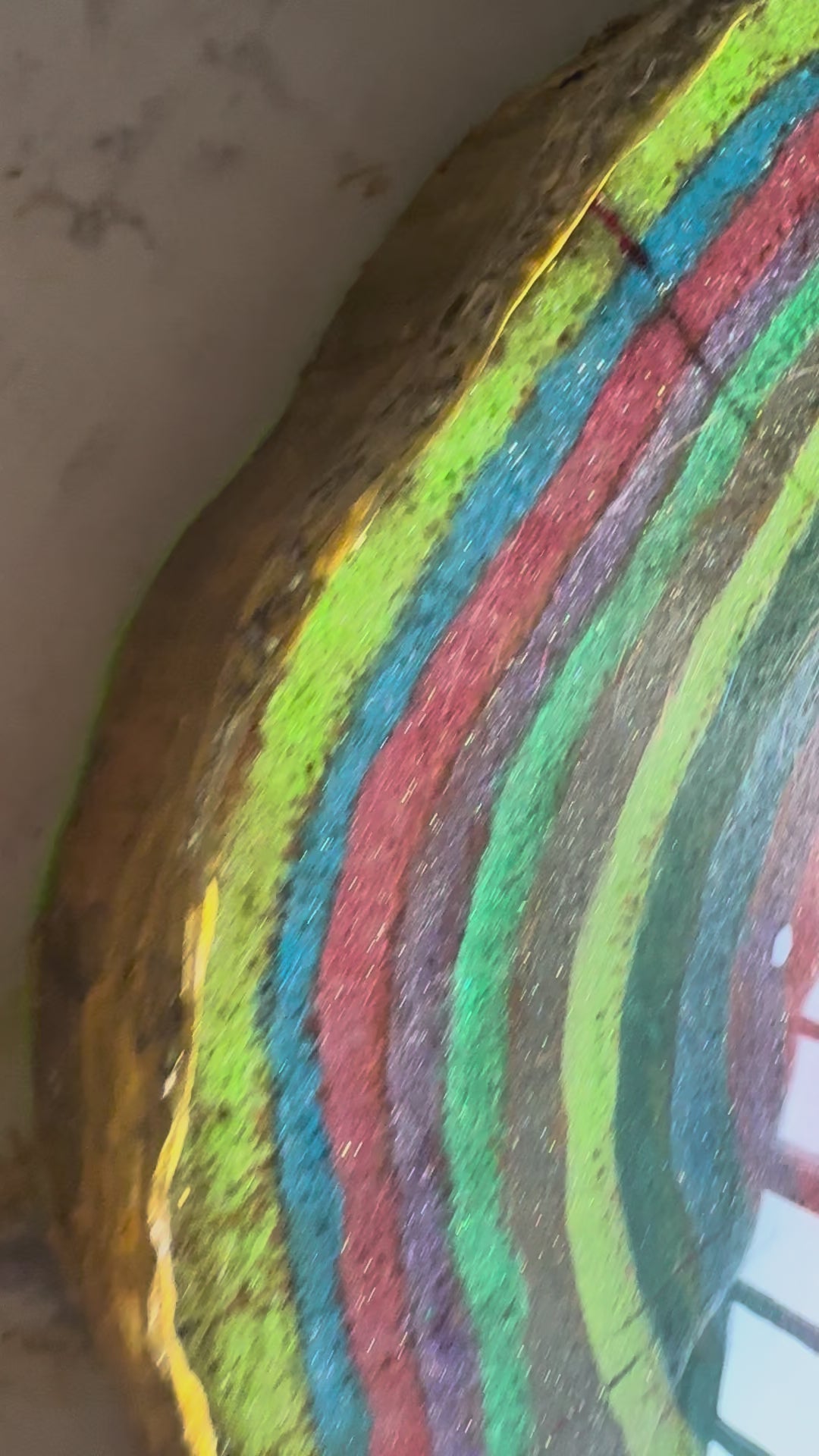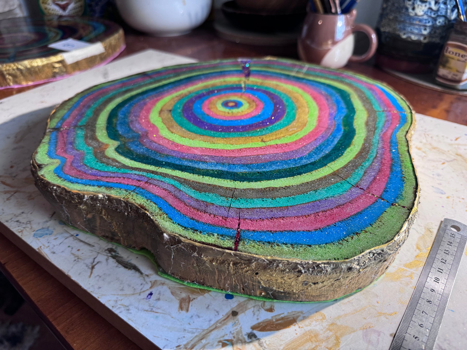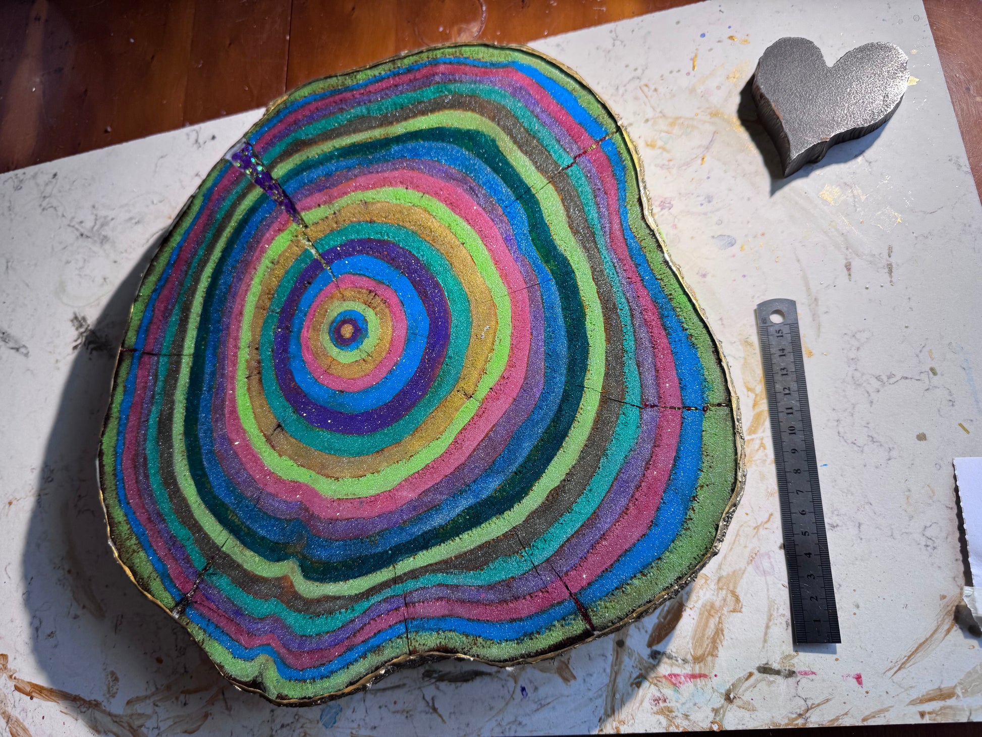 A large 35cm diameter tree slice, painted, epoxied and felt backed. The epoxy is none toxic/eco friendly. The majority of the proceeds from the sale of this plinth will go to displaced Palestinian families.