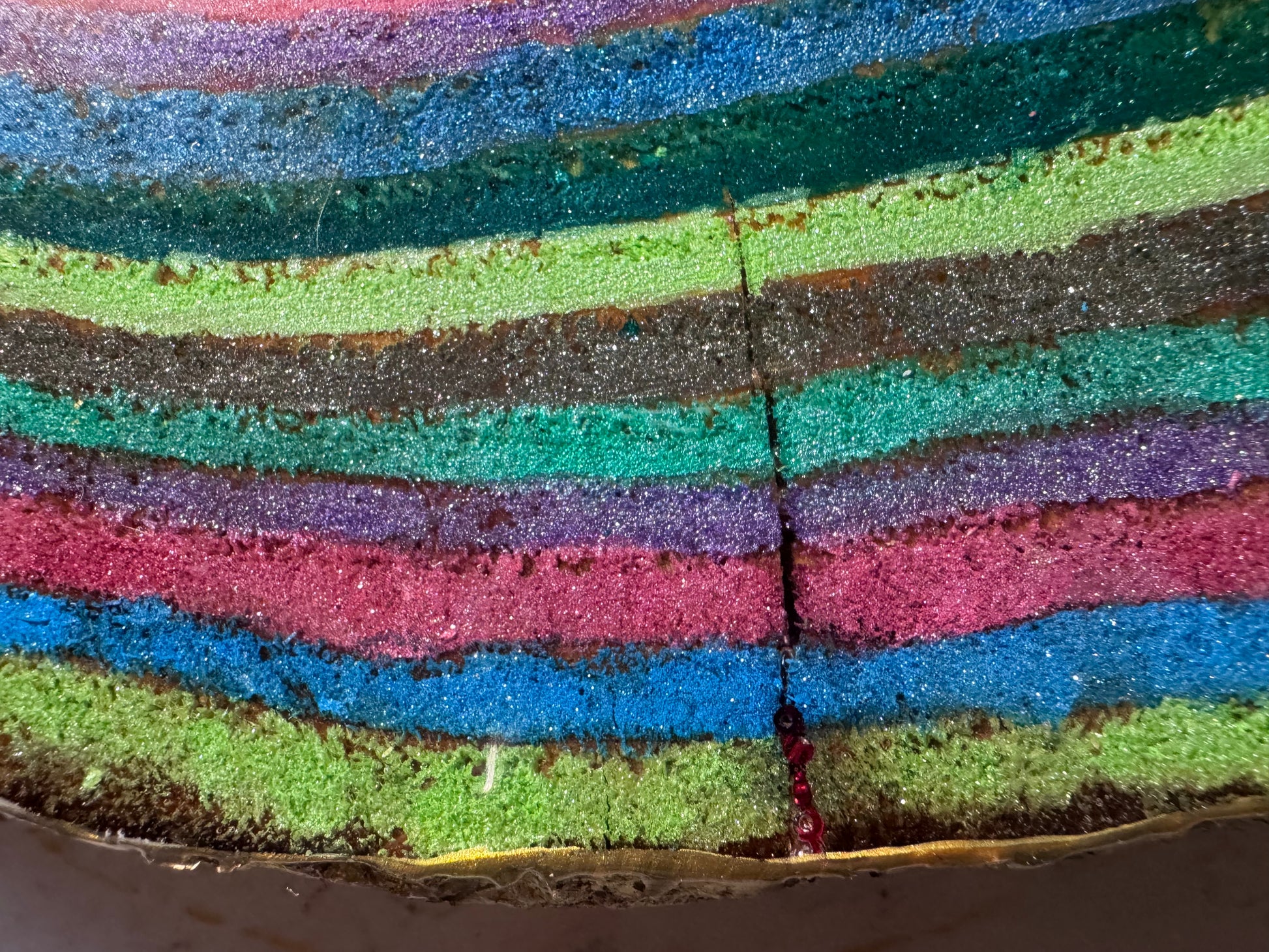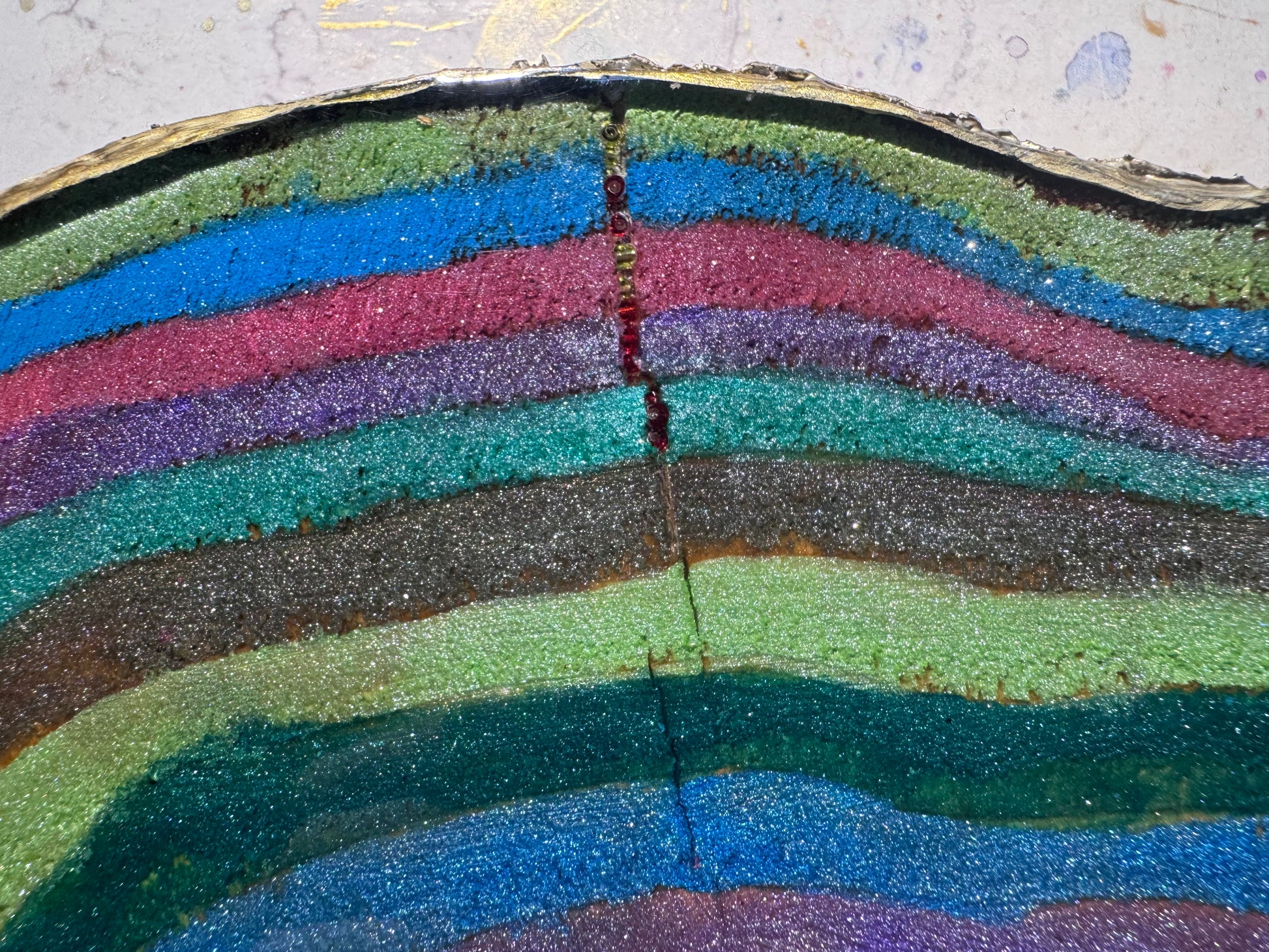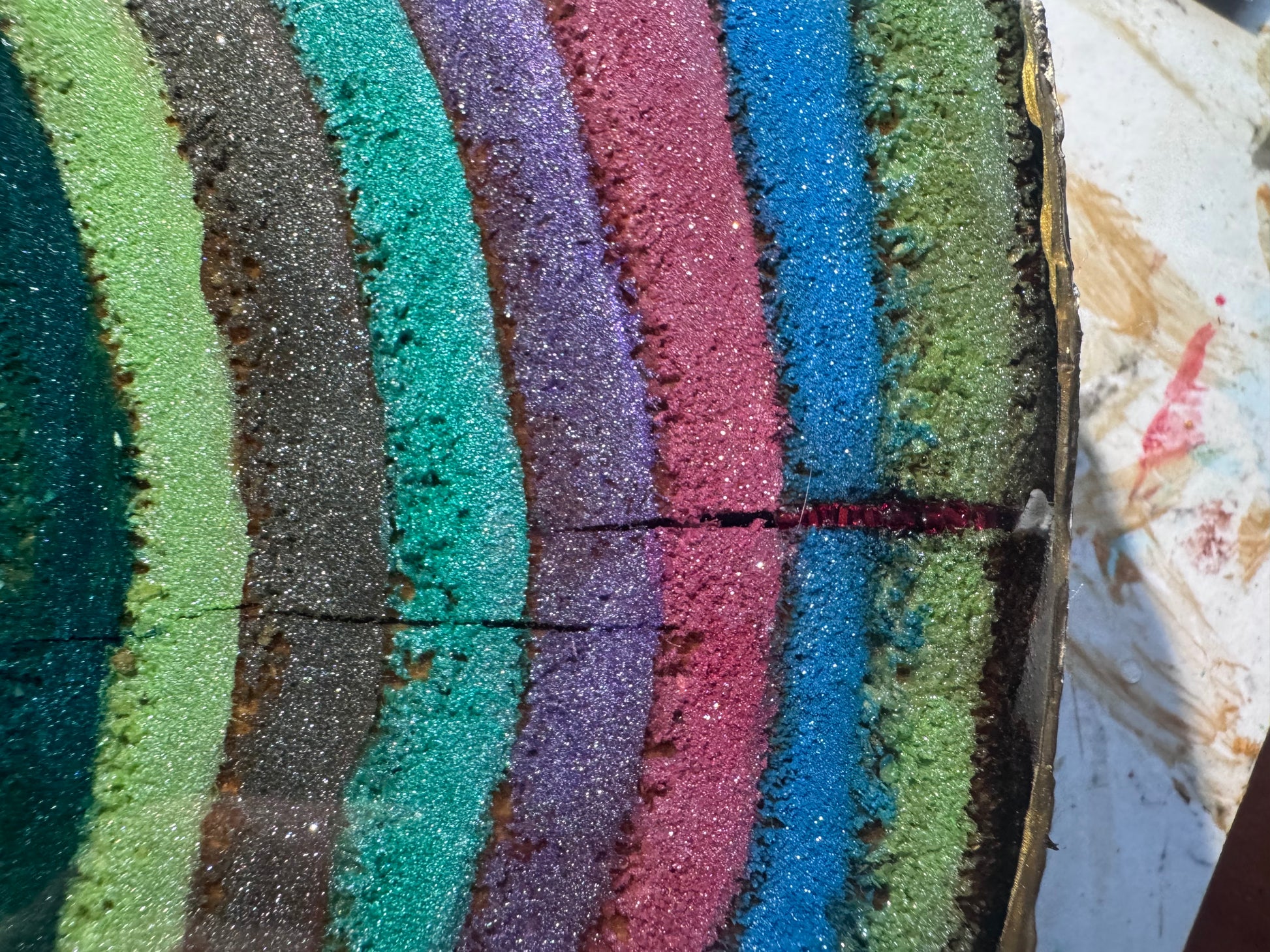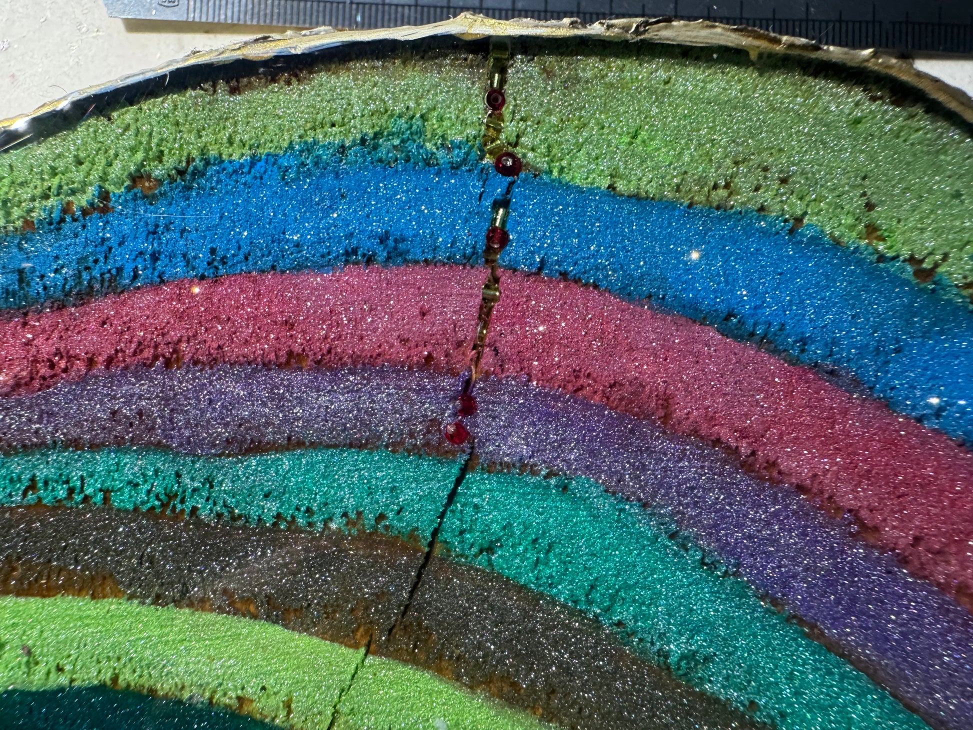 A large 35cm diameter tree slice, painted, epoxied and felt backed. The epoxy is none toxic/eco friendly. The majority of the proceeds from the sale of this plinth will go to displaced Palestinian families.