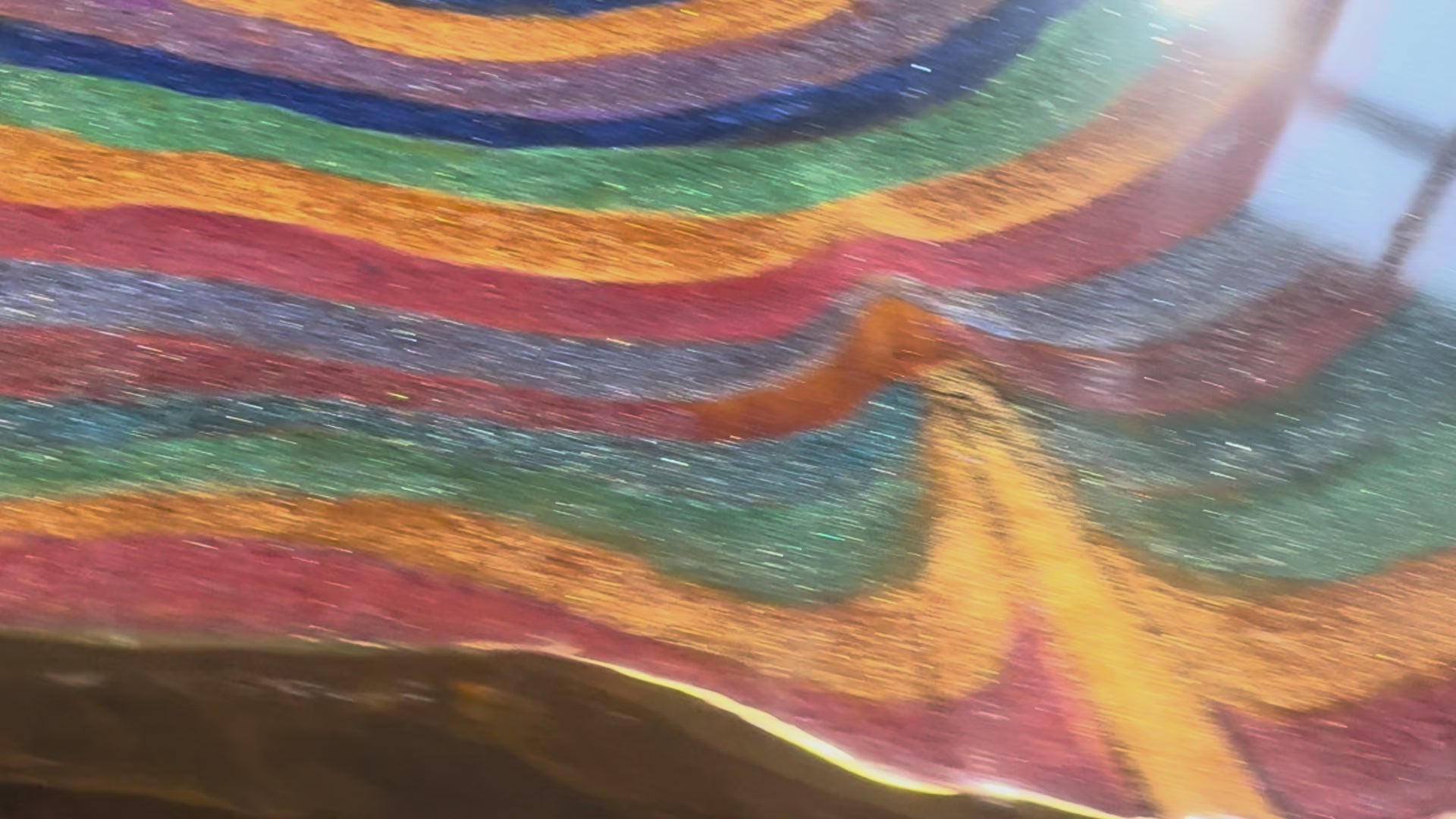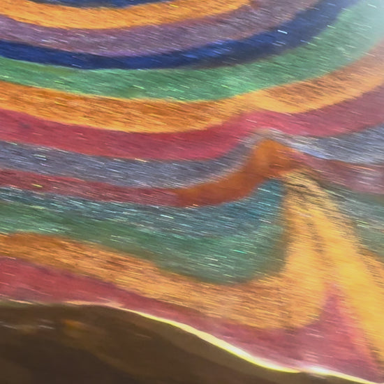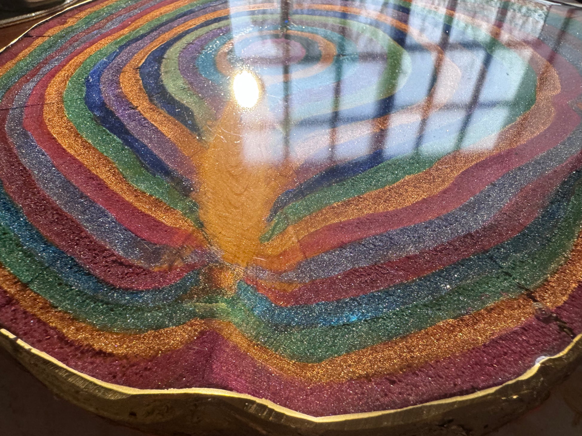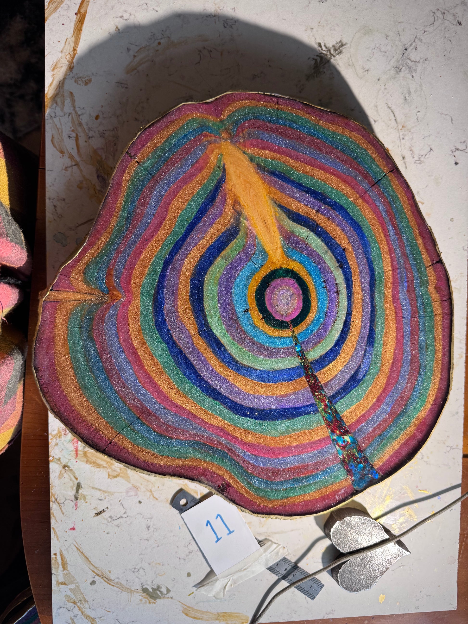 A large 36cm diameter tree slice, painted, epoxied and felt backed. The epoxy is none toxic/eco friendly. The majority of the proceeds from the sale of this plinth will go to displaced Palestinian families.