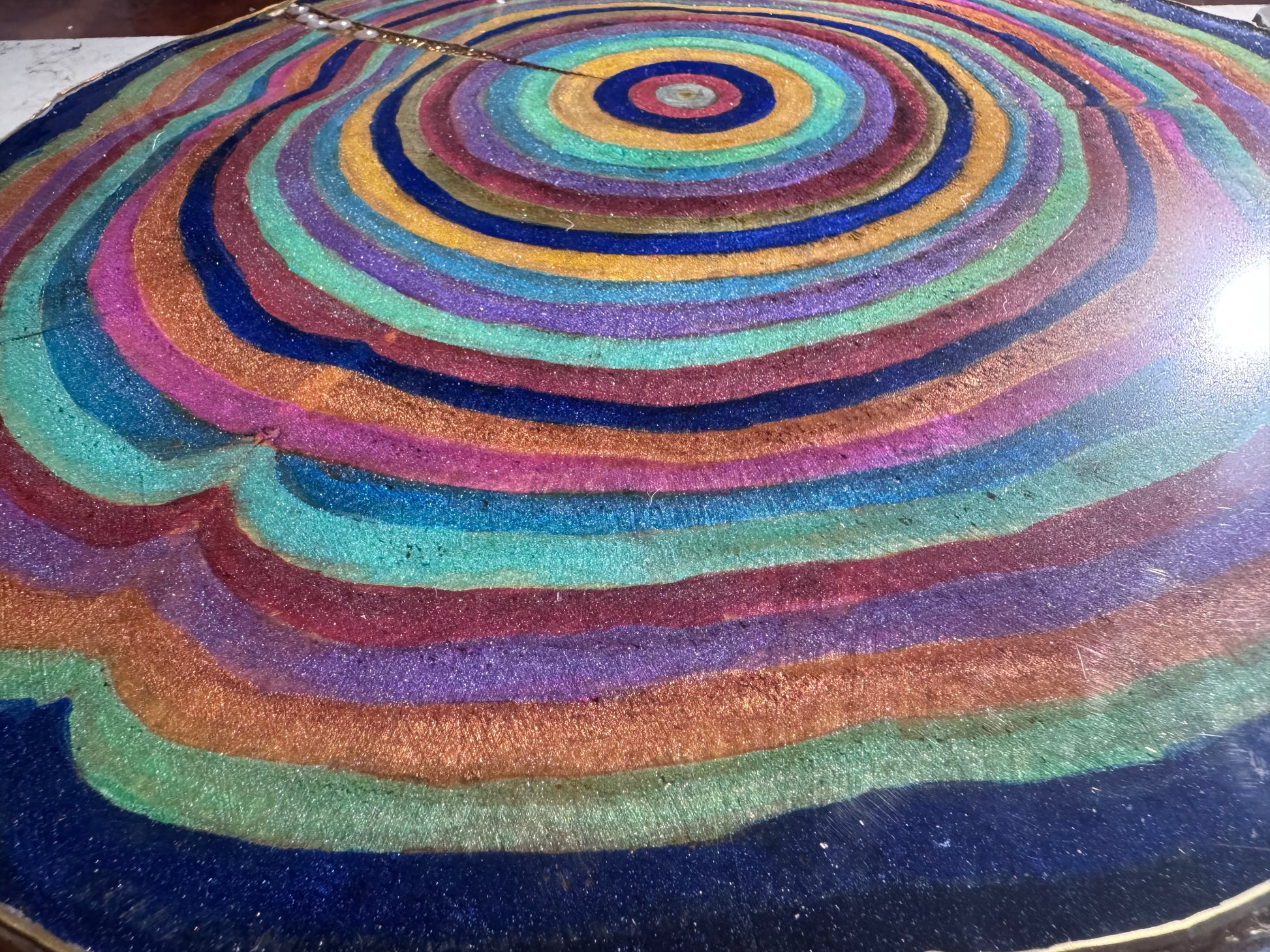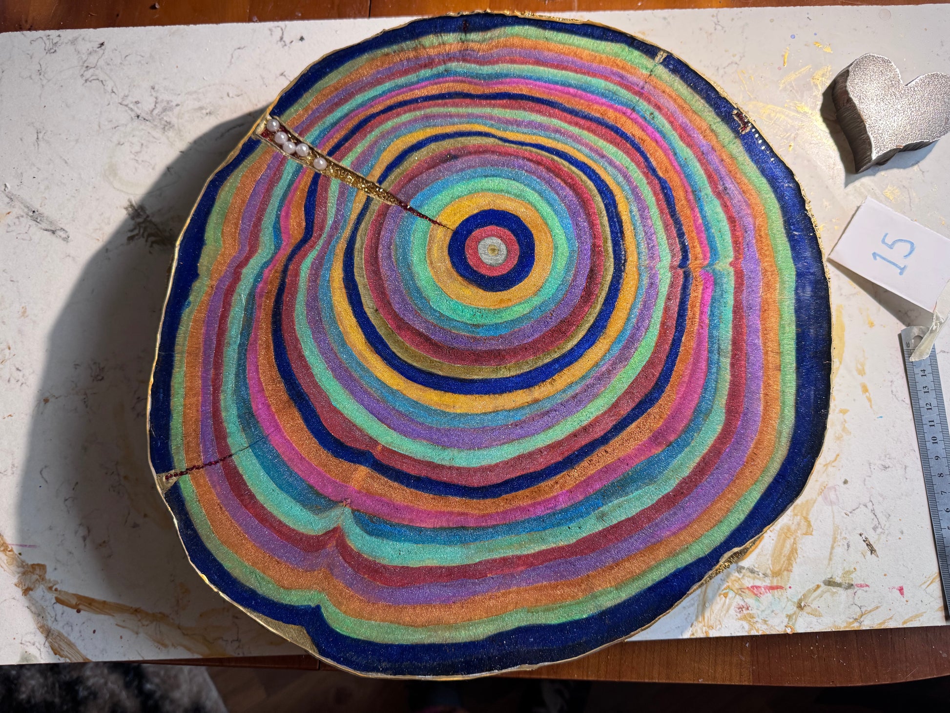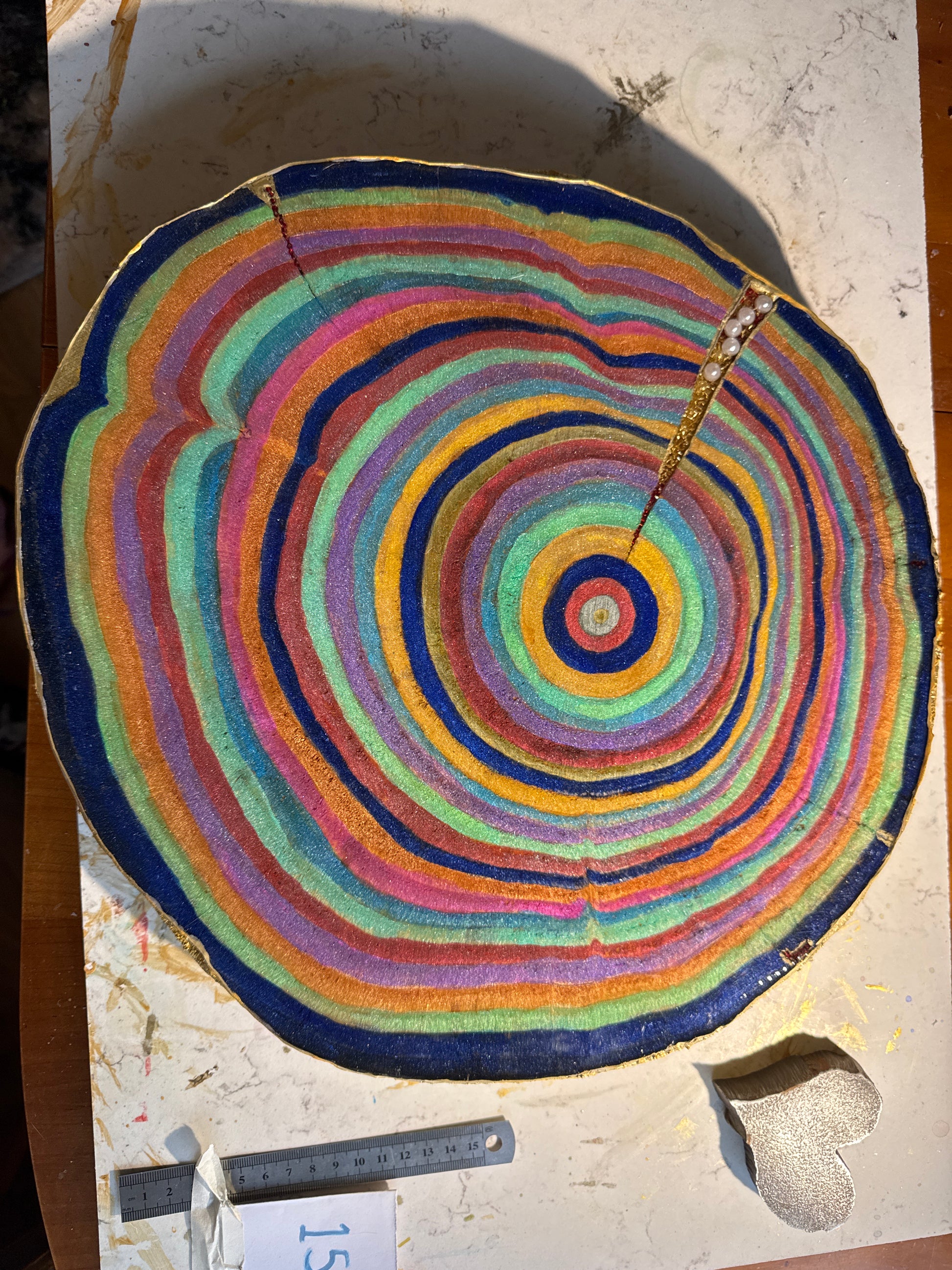 A large 38cm diameter tree slice, painted, epoxied and felt backed. The epoxy is none toxic/eco friendly. The majority of the proceeds from the sale of this plinth will go to displaced Palestinian families.