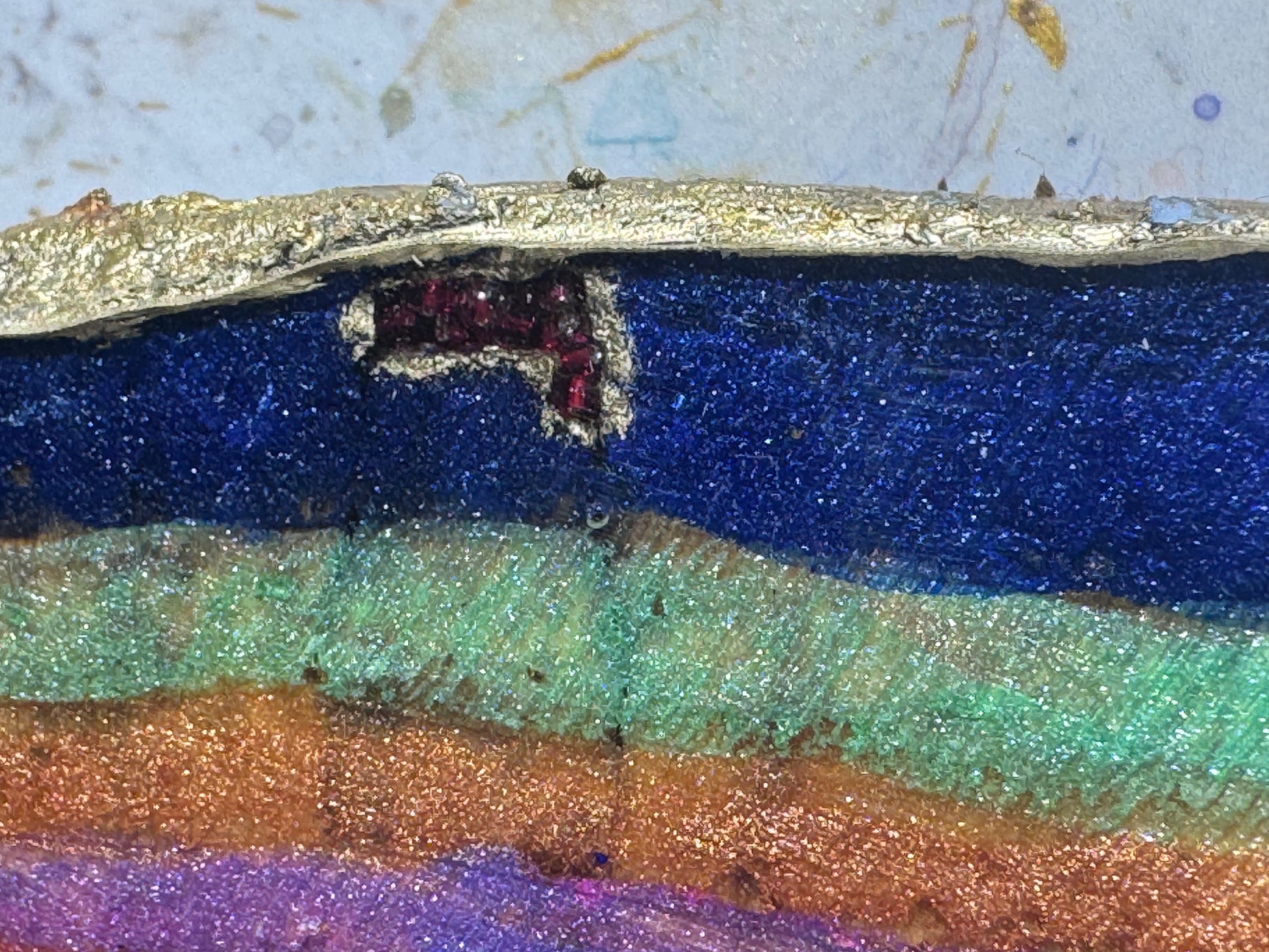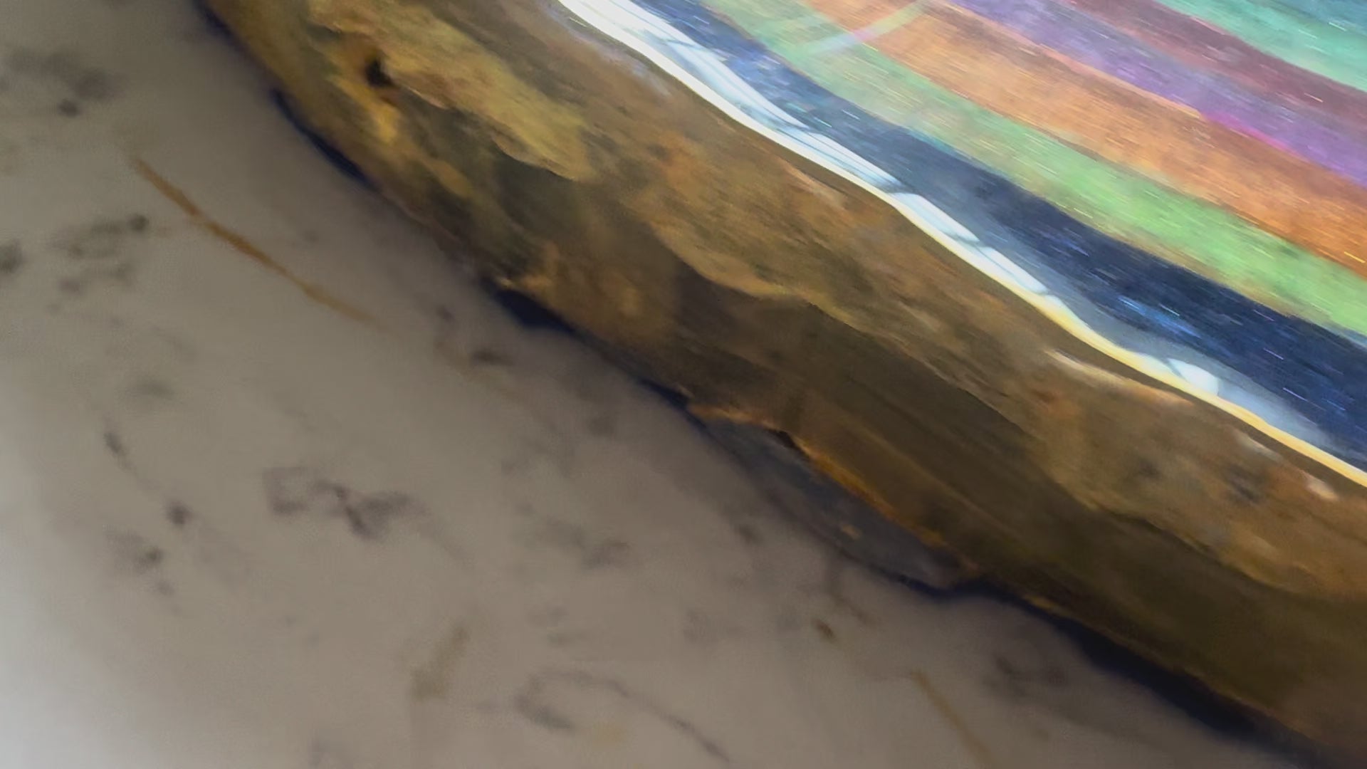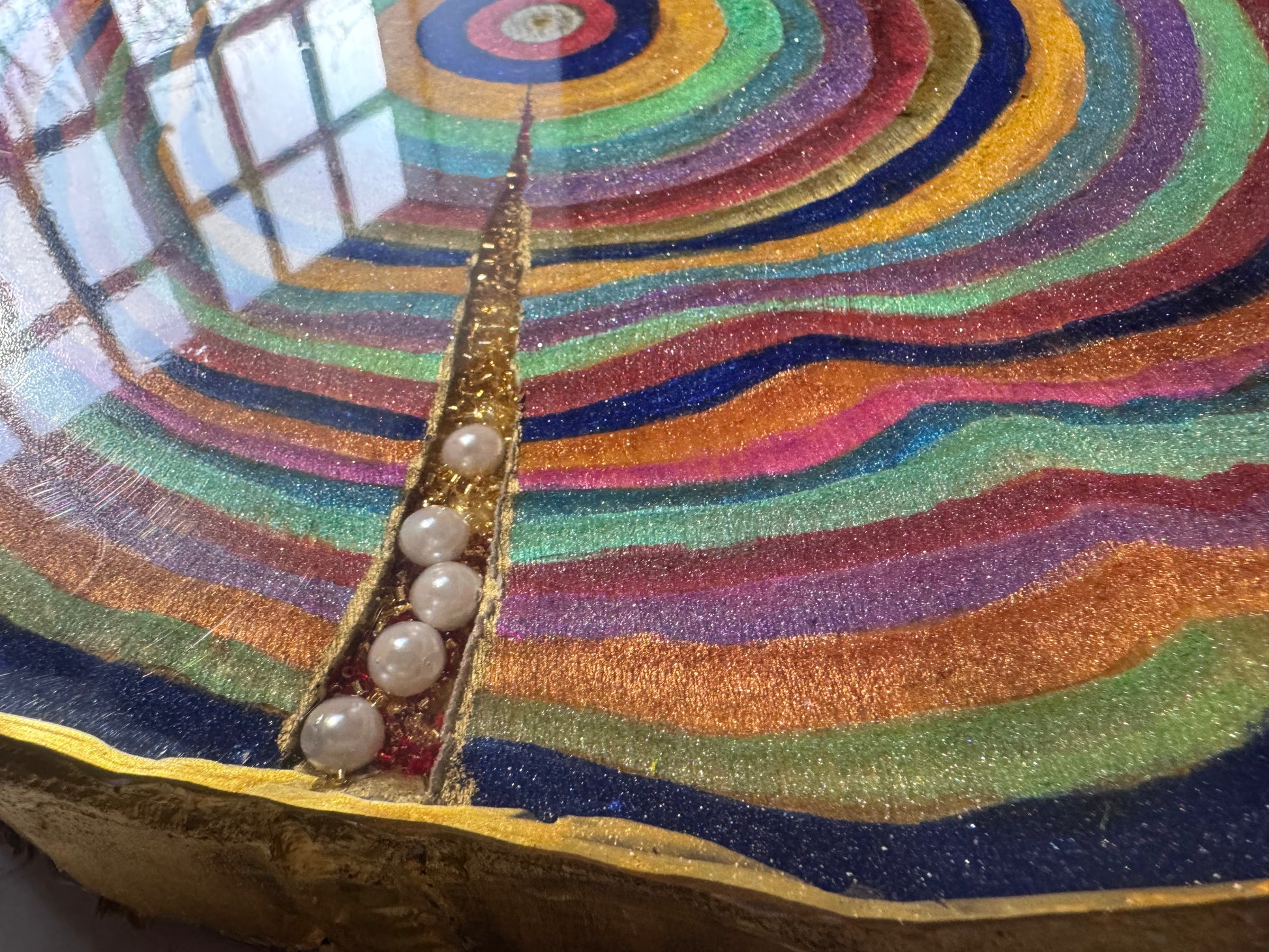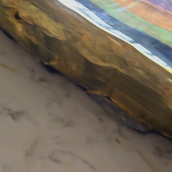 A large 38cm diameter tree slice, painted, epoxied and felt backed. The epoxy is none toxic/eco friendly. The majority of the proceeds from the sale of this plinth will go to displaced Palestinian families.
