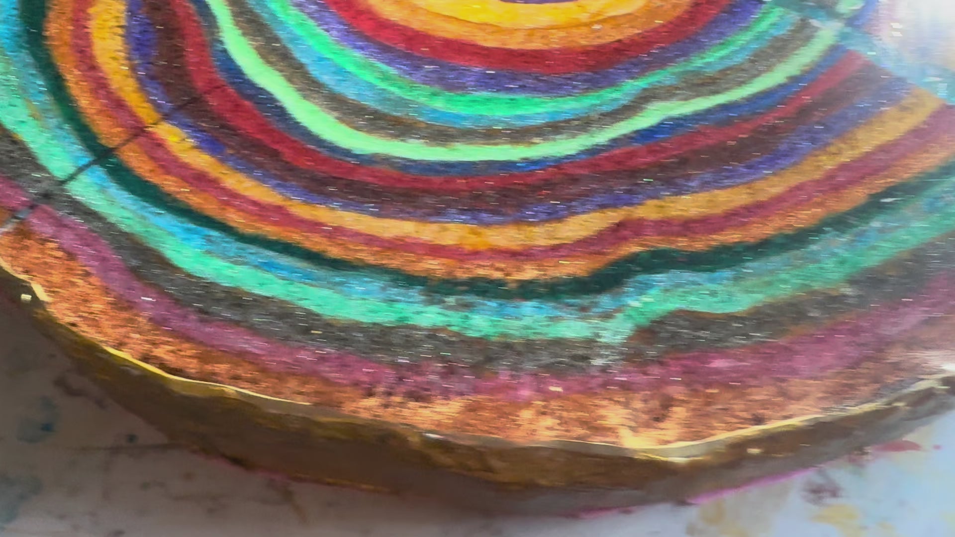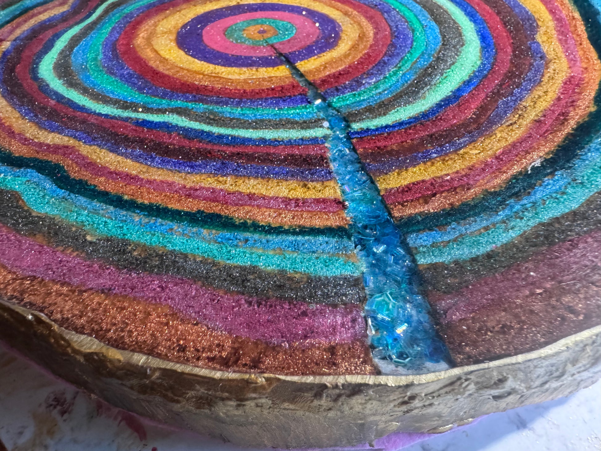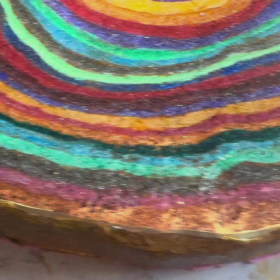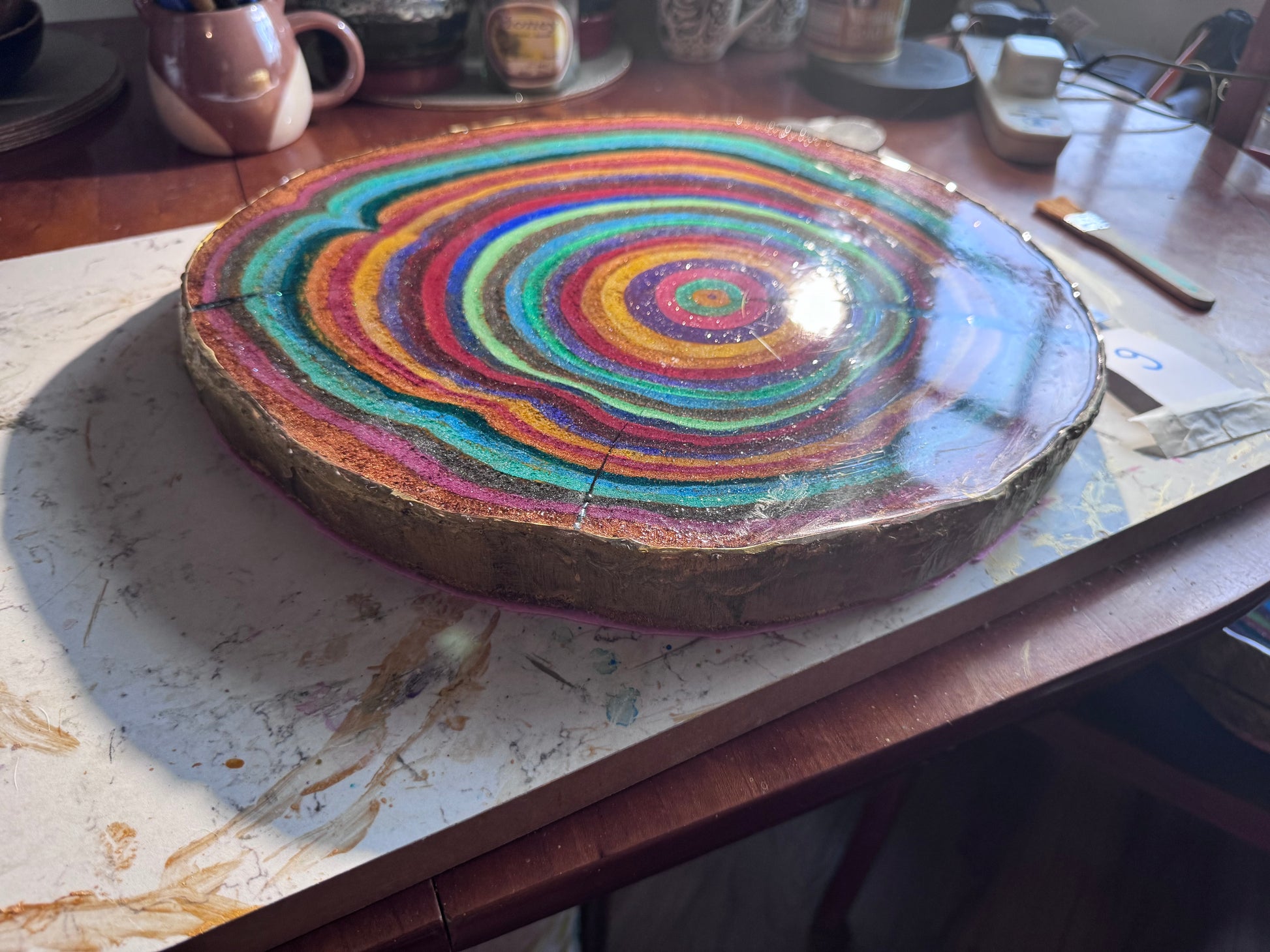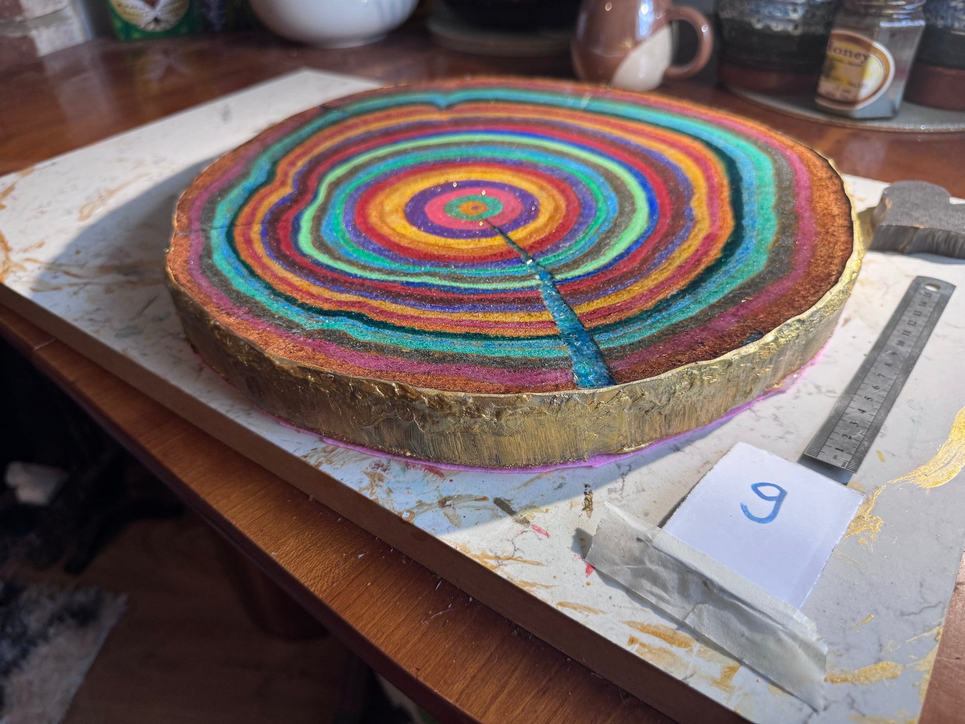 A large 37cm diameter tree slice, painted, epoxied and felt backed. The epoxy is none toxic/eco friendly. The majority of the proceeds from the sale of this plinth will go to displaced Palestinian families.