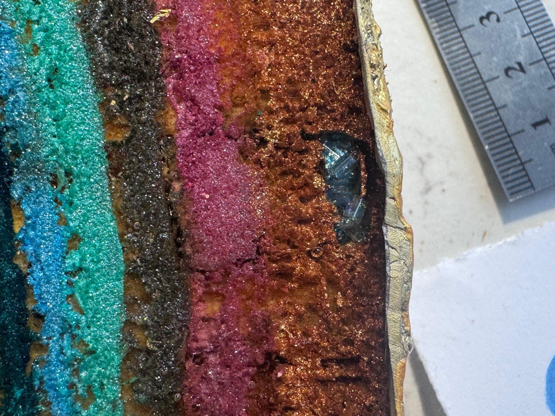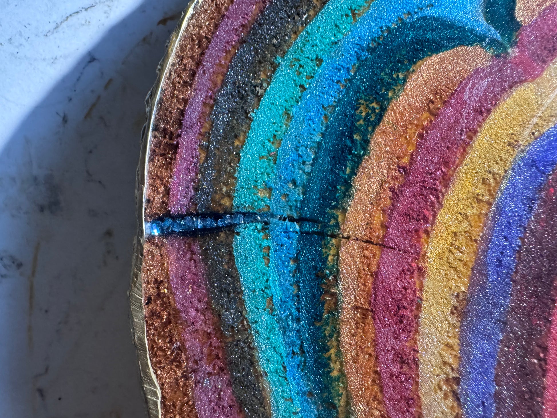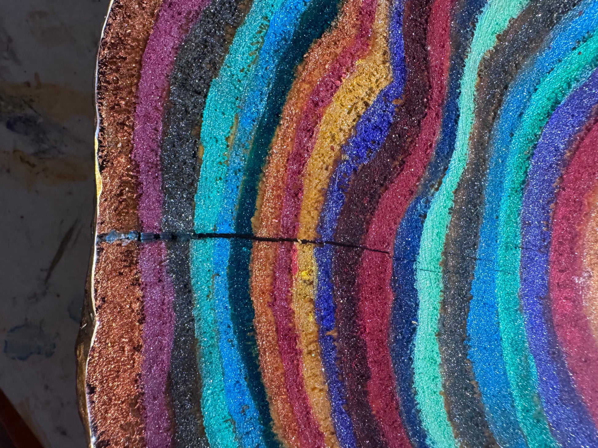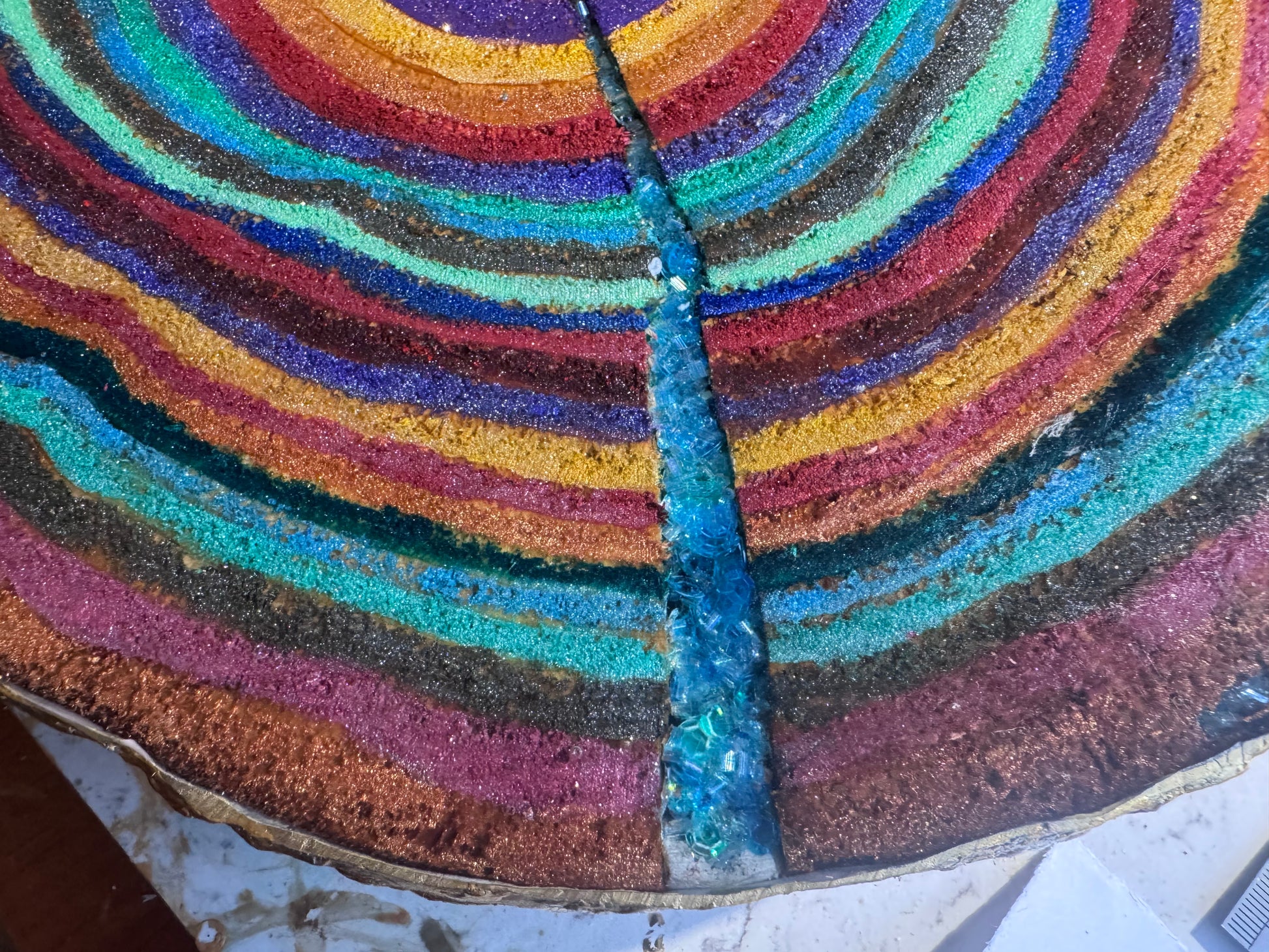 A large 37cm diameter tree slice, painted, epoxied and felt backed. The epoxy is none toxic/eco friendly. The majority of the proceeds from the sale of this plinth will go to displaced Palestinian families.